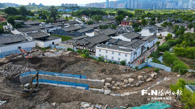 靠近梁厝地铁站,一个钢坝闸已经完成结构施工。“这是我们配套建设的钢坝闸,一旦街区蓄水,钢坝闸就会向外排水,平时水位低时,它也可以将外面的梁厝河甚至是闽江水引进来进行循环。”项目负责人介绍,与周边相比,梁厝特色历史文化街区的地势较低,二期通过场地氛围优化、建设品质升级等手段,进一步提高街区的安全和防洪系数。