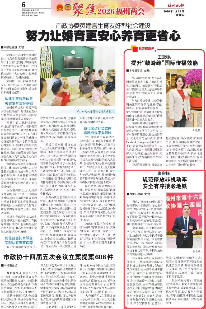 张金峰委员提出四方面具体建议:一是因地制宜建设完善非机动车停车场地,在城郊站点可建设立体停车库或带棚停车场,在市中心空间有限站点可合理利用树荫或搭建遮阳棚,划定规范停车区域;二是推进智慧管控,在停车棚加装温感探头与自动喷淋装置以防范火灾,并依托“e福州”等平台实现车位余量实时查询与导航,引导分散停车;三是强化长效治理,结合宣传教育、志愿者引导及“文明积分”奖励等方式,培养市民规范停车习惯;四是优化公交接驳,加密地铁接驳公交线路,提升公交线网社区化覆盖率,从源头上减少短途非机动车流量。