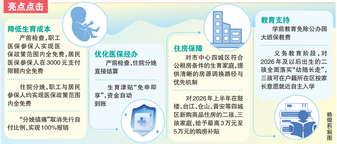 生育决策的背后,是住房、教育、就业等一系列长远考量。福州的“呵护工具包”,着眼于家庭发展的全周期,提供四项坚实保障。