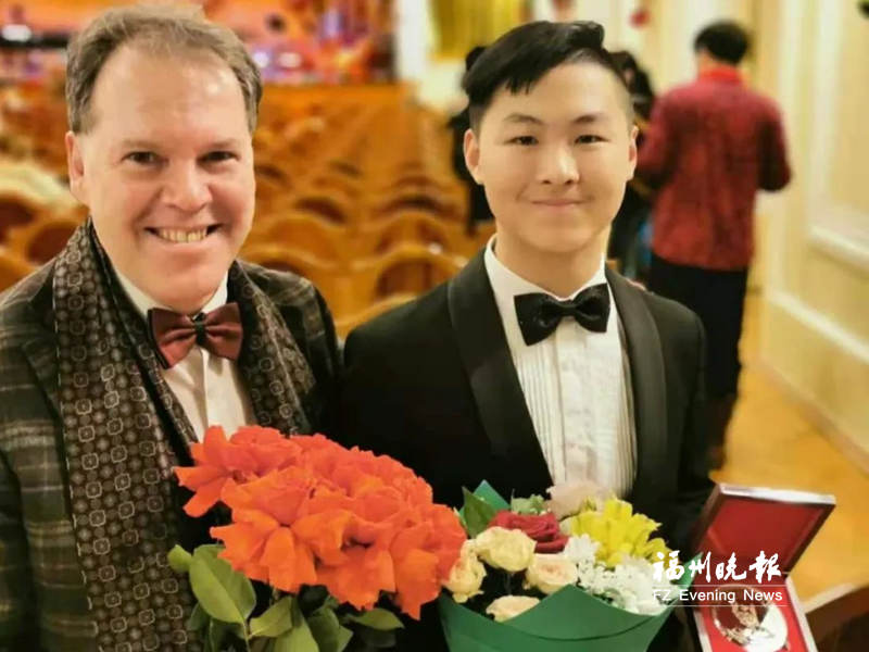 倪晨哲(右)获奖后与导师合影。福建省音协供图