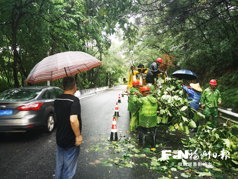 “鼓岭上山路两棵大树倒了,需要马上处理!”17日8点,晋安区交通局公路养护中心接到山区群众报警,交通局立刻组织养护人员沿着上山公路巡查至事发点。