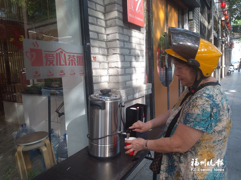 一名在此喝茶的依姆告诉记者,她今年72岁,家就在对面小区,“我经常骑着电动车出门买菜、办事,渴了、累了,能及时喝上一杯‘爱心茶’,真是太好了!”