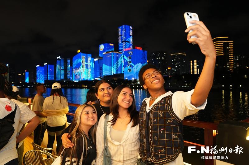 船行至鳌峰洲大桥,江面骤然绚烂。闽江灯光秀成为最璀璨的背景——解放大桥的流光与中洲岛的灯影交相辉映,江面倒影与灯光交织成流动的画卷,让美国友人在光影流转间感受闽都文化的细腻与厚重。