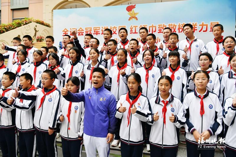 本次活动以“冠军进校园”为契机,引导少先队员从榜样身上汲取奋进力量,筑牢“强国有我”的信念根基。图为李发彬与福州第十六中学的少先队员代表合影。