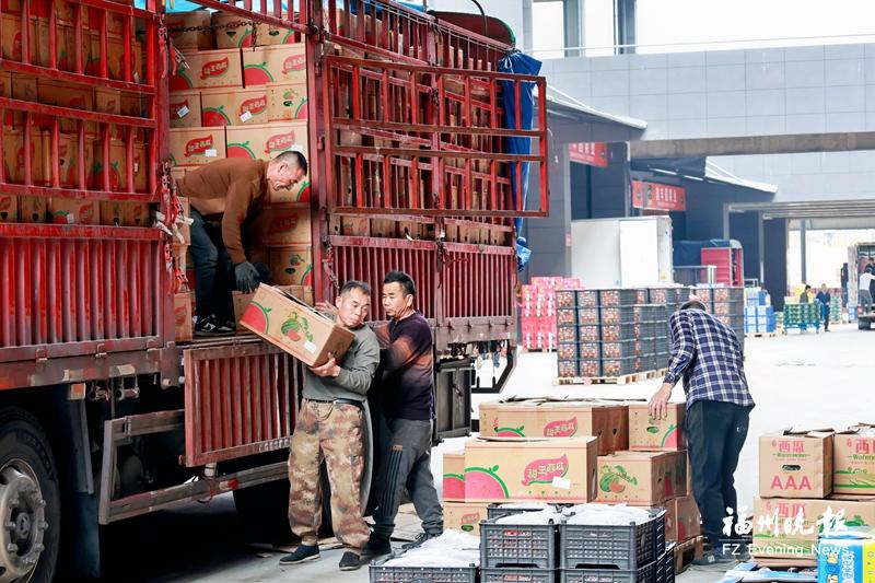 在中国(连江)海峡国际农产品物流园,工人搬运蔬果。