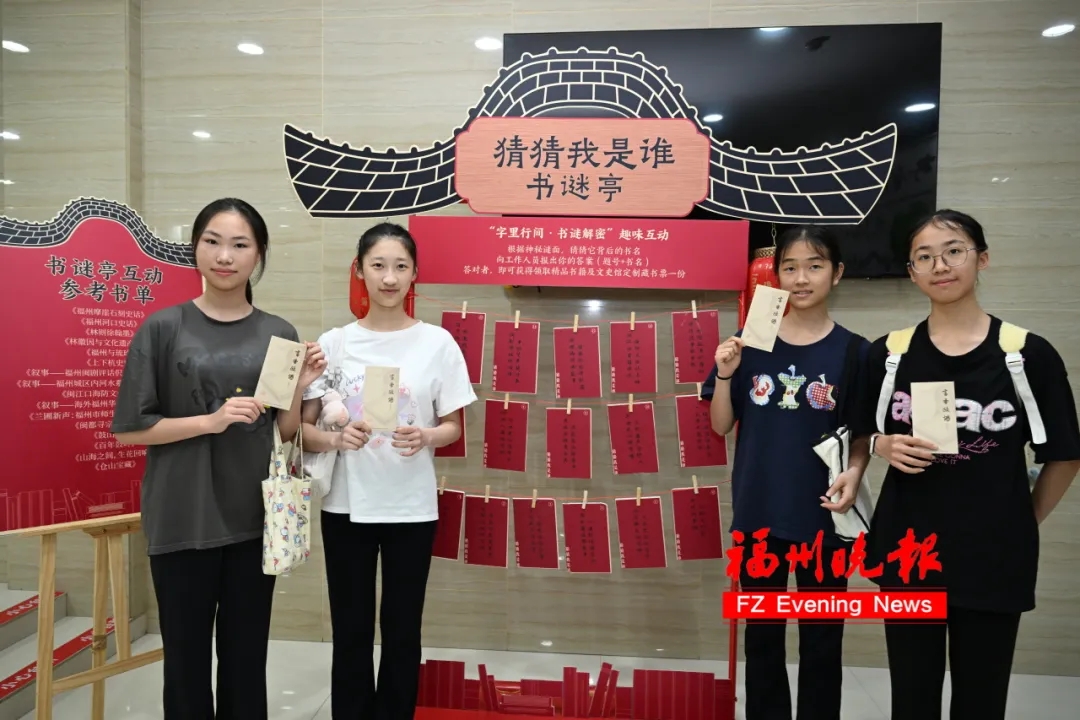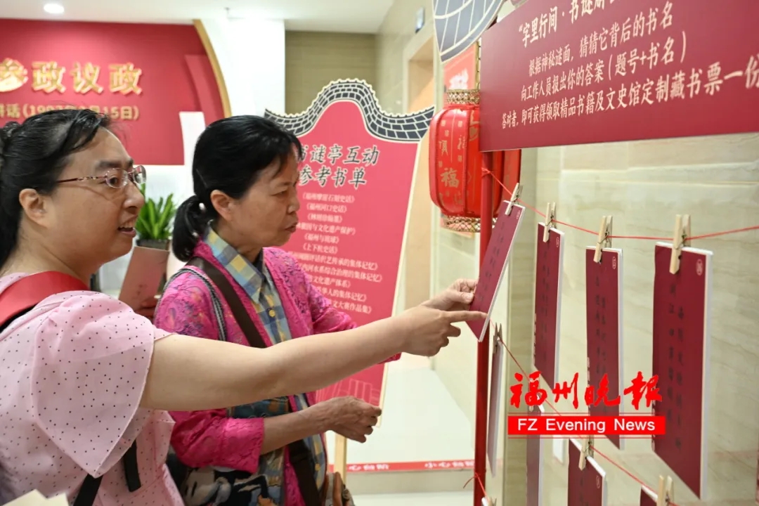 “字里行间?书谜解密”趣味互动中,书谜亭悬挂的文史书签吸引众多市民参与,答对福州文史相关谜题,即可免费领取精品书籍;