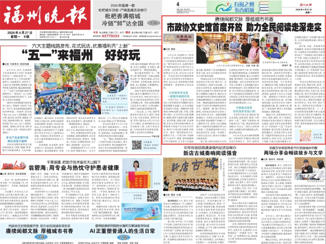 “举办文史馆开放日活动、亮相福州书展,增设专柜、推进‘八进’,就是要打破场馆壁垒,让珍藏文献走出库房、走进大众,普及闽都文化,助力全民阅读走深走实。”福州市政协文化文史和学习委负责人表示,提倡全民阅读、建设书香社会,功在当代、利在千秋,是一项需要全社会共同参与、协同推进的长期任务。下一步,市政协将持续深耕书香文化建设,常态化开展文史专题讲座,持续打响“书香政协”特色品牌,让闽都文脉代代相传,为全民阅读发展、书香榕城建设持续贡献政协力量。