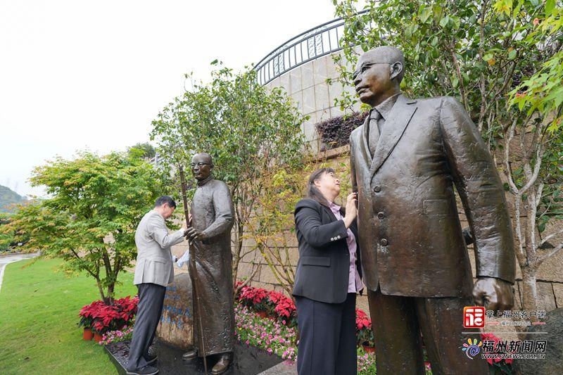 吴红(右)、何代宁手持白色毛巾,轻轻擦拭吴石、何遂将军塑像。