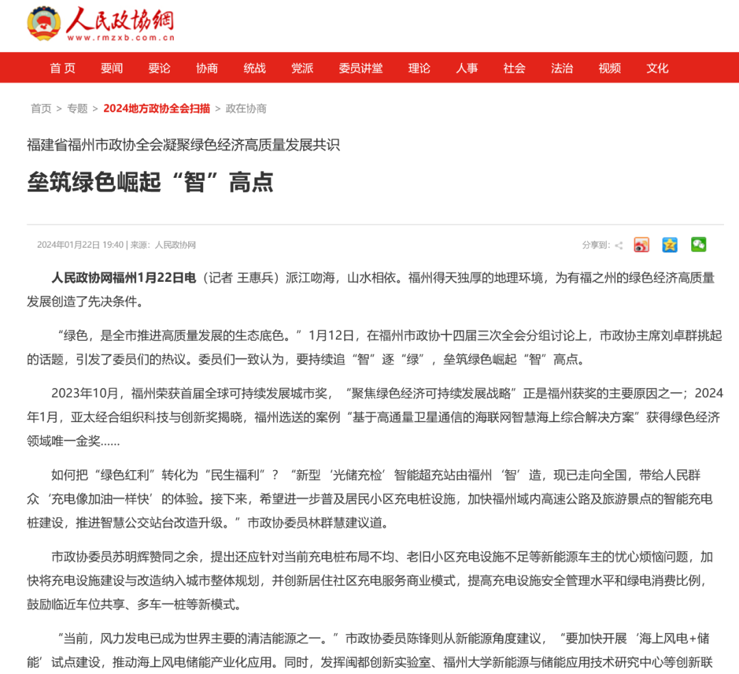 如何把“绿色红利”转化为“民生福利”?“新型‘光储充检’智能超充站由福州‘智’造,现已走向全国,带给人民群众‘充电像加油一样快’的体验。接下来,希望进一步普及居民小区充电桩设施,加快福州域内高速公路及旅游景点的智能充电桩建设,推进智慧公交站台改造升级。”市政协委员林群慧建议道。