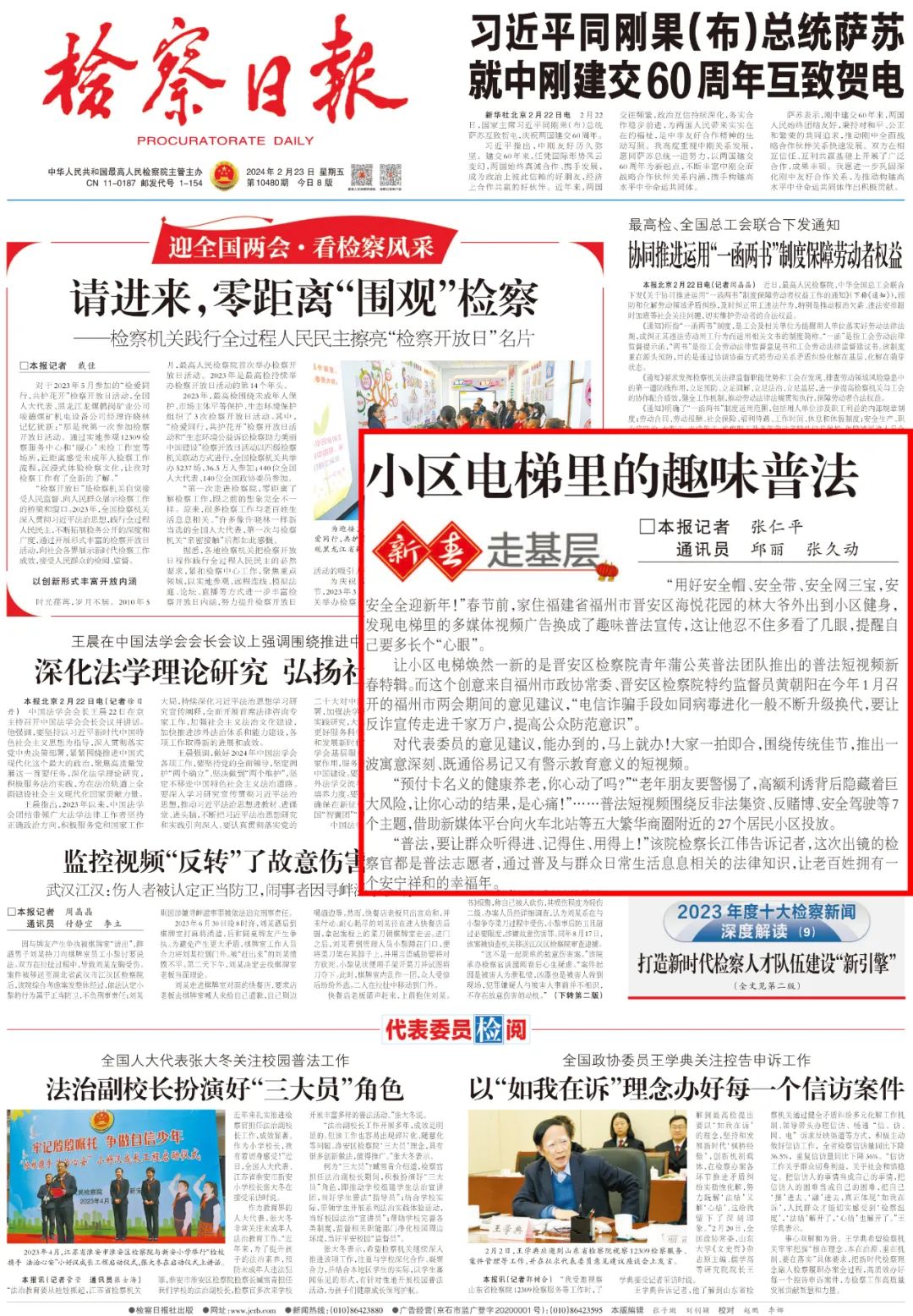 2月23日,《检察日报》头版刊登通讯《小区电梯里的趣味普法》,介绍福州金通视博传媒公司通过小区电梯内的多媒体智能屏,在春节期间广泛开展短视频普法,让法治融入春节,“飞入寻常百姓家”,共创平安幸福年。