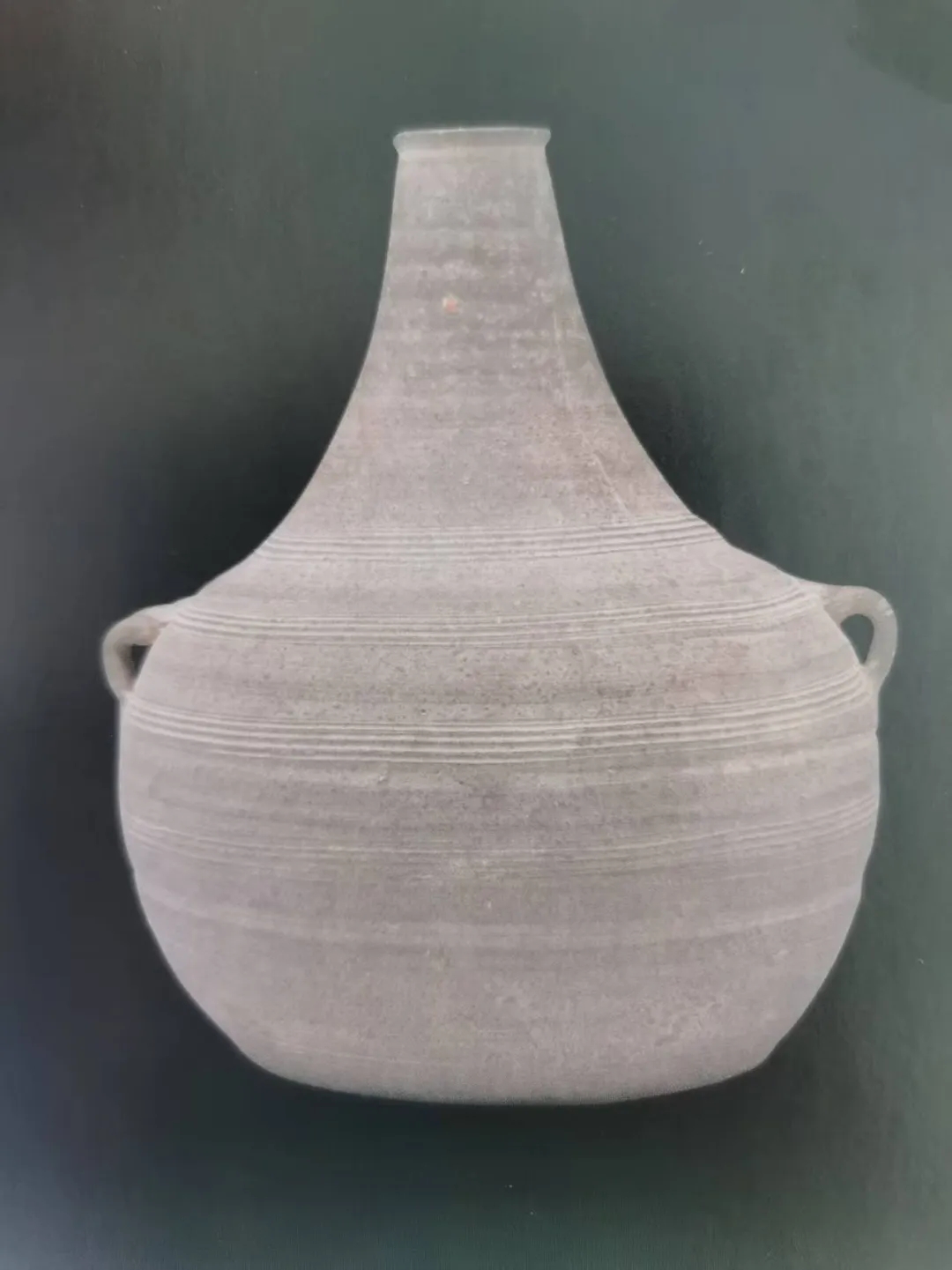 汉弦纹双系灰陶匏壶,为泥质灰陶壶,微侈口,长颈,广弧肩,对称的桥形双耳,鼓腹,平底微内凹,高21厘米、口径3.5厘米、腹围18厘米、底径12厘米。壶身现灰泥陶本色,陶胎干净,坚固致密,壶肩与上腹部饰有四组弦纹,每组三道,器型端庄,造型简洁明朗,美观实用,具有西汉中期闽江下游陶器的风格,是一件融严格的淘泥工艺、成熟的轮制技术、简朴的原始审美于一体的镇馆之宝。